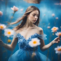 1girl, standing, upperbody, under water, longexposure , in the style of ethereal portraiture, selective focus,  flowers dress, in the middle of blue water, flower around