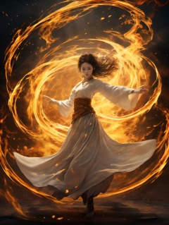 (1girl),traditional_clothes,flying,full_shot,fire,HWXY,ruins,magic circles,