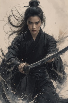sdmai, wuxia, Chinese ink painting, artistic ink painting, Chinese martial arts films, wearing black robes, fighting posture, cinematic grandeur, splashing details, wild and powerful, weapon, sword, solo, black hair, holding weapon, holding sword, looking at viewer, holding, 1boy, male focus, hair bun, katana, japanese clothes, single hair bun, topknot, fighting stance, long hair <lora:SDMAI武侠wuxia:0.8>