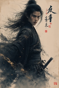 sdmai, wuxia, Chinese ink painting, artistic ink painting, Chinese martial arts films, wearing black robes, fighting posture, cinematic grandeur, splashing details, wild and powerful, weapon, sword, solo, 1boy, black hair, male focus, holding weapon, holding, holding sword, long hair, looking at viewer, topknot, japanese clothes, scar, hair bun, katana  <lora:SDMAI武侠wuxia:0.8>