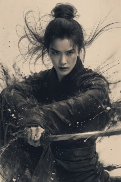 sdmai, wuxia, Chinese ink painting, artistic ink painting, Chinese martial arts films, wearing black robes, fighting posture, cinematic grandeur, splashing details, wild and powerful, solo, weapon, sword, male focus, 1boy, looking at viewer, black hair, monochrome, japanese clothes, katana, hair bun, single hair bun, holding weapon, holding sword <lora:SDMAI武侠wuxia:0.8>