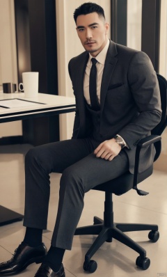 a man,male focus,(masterpiece, Realism, best quality, highly detailed,profession),asian,exquisite facial features,handsome,muscular,sitting on chair,Business suit,socks,footwear,full body shot,soft lighting,blurry,xiewa, 1man