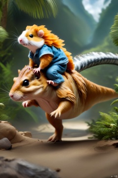 Hamster riding a dinosaur, tiny hamsters and giant dinosaurs,Tyrannosaurus rex, dinosaur, beautiful feathers, scary teeth, ((Best quality)), ((Best quality)),((Best quality)),((realistic)),((exterior view)),photo realistic,(masterpiece),orante,super detailed,intricate,photo like image quality, Hamster, ZLJ