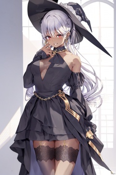 (masterpiece, extremely detailed 8k wallpaper,best quality, good_hand, nice_hand, 5_fingers), (best illumination, extremely delicate and beautiful), finely detail, PIXIV, 1girl, solo, JIMA, lolicon, child, loli, long_hair, silver_hair, princess_cut, ((black_skin, dark_skin, brown_skin)), red_eyes, shiny_hair, witch_hat, black_coat, average_breasts, indoors, cowboy_shot, happy_face, ear_rings, gold_jewelry, gold_trim, lace_trim, gothic_lolita, big_thighs, thigh_highs, metal_collar, detached_sleeves, long_sleeves, long_skirt, long_dress, castle, royal,