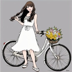 chahua,1girl, bicycle, solo, ground vehicle, brown hair, flower, bouquet, long hair, dress, white dress, smile, shoes, <lora:日系二次元人物_插画_V1.0XL:1>, masterpiece, best quality,