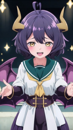 1girl,solo,open mouth,smile,short hair,blush,ahoge,looking at viewer,bangs,horns,wings,yellow eyes,demon girl,demon wings,school uniform,serafuku,hair between eyes,