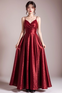 1girl,jewelry,(red evening dress:1.2),iridescence,upper body,white background,photo,(standing:1.3),(look at the front:1.3),