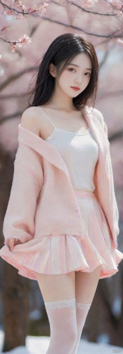 1 girl,Transparent skirt,pink face,stockings,(snow:1.2),(snowing:1.2),peach blossom,snow,solo,scarf,black hair,long hair,bokeh,realistic,long coat,blurry, captivating gaze, embellished clothing, natural light, shallow depth of field, romantic setting, dreamy pastel color palette, whimsical details, captured on film,. (Original Photo, Best Quality), (Realistic, Photorealistic: 1.3), Clean, Masterpiece, Fine Detail, Masterpiece, Ultra Detailed, High Resolution, (Best Illustration), (Best Shadows), Complex, Bright light, modern clothing, (pastoral: 1.3), smiling,standing,(very very short skirt:1.5),knee socks,(white shoes: 1.4),long legs, forest, grassland,(view: 1.3), 21yo girl, striped, wangyushan, capricornus,  light master,police,pencil_skirt,yellow_dress