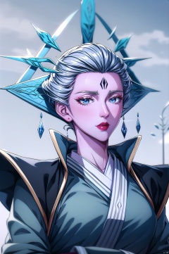 Xuewang, 1girl, blue eyes, solo, ice, upper body, forehead mark, makeup, looking at viewer, grey hair, red lips, lipstick, crystal, closed mouth, hair ornament, chinese clothes,  nice hands, Xuewang