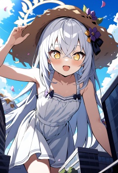 1girl, azusa \(blue archive\), blue archive, halo, blush, open mouth, bangs, bow, hair between eyes, bare shoulders, very long hair, standing, collarbone, yellow eyes, :d, small breasts, outdoors, day, white dress, arm up, blue sky, bare arms, petals, leaning forward on skyscraper, sleeveless dress, depth of field, white skirt, hat ribbon, cloudy sky, sun hat, blurry foreground, brown headwear, straw hat, hand on headwear, sundress, skyscraper, building size, giantess, looking down at viewer, masterpiece, best quality, absurdres, ultra detailed
