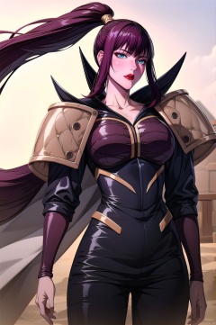 Fengwang, 1girl, solo, long hair, brown hair, blue eyes, lipstick, high ponytail, armor, looking at viewer, red lips, cape, makeup, collarbone, bangs,  nice hands, Fengwang