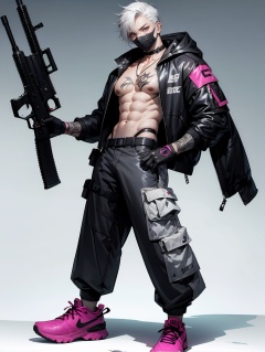 hezi, Cyberpunk, Sotai, weapon, 1boy, male focus, tattoo, solo, abs, mask, gun, jacket, gloves, pectorals, muscular male, bara, shoes, pants, open jacket, open clothes, belt, muscular, nipples, navel, bare pectorals, holding, holding weapon, jewelry, white background, large pectorals, white hair, mouth mask, pink footwear, collar, black gloves, looking at viewer, simple background, scar, earrings, fingerless gloves, covered mouth, short hair, sneakers, holding gun, rifle, chest tattoo, socks, underwear, arm tattoo, stomach tattoo, black jacket, spiked hair, mature male, choker, hood, piercing, navel hair, scar on face, no shirt, necklace, black belt, grey eyes, heterochromia, assault rifle, hood down, ear piercing, hooded jacket, standing, full body, grey hair, red eyes, grey pants, blue eyes, buckle, neck tattoo, male underwear, long sleeves, zipper, pouch, black mask, thick eyebrows, thong, thick arms, bangs, scar across eye<lora:索泰:0.6>