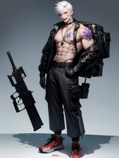 hezi, Cyberpunk, Sotai, weapon, solo, abs, jacket, white background, gun, shoes, open clothes, pants, male focus, 1boy, gloves, pectorals, tattoo, muscular, simple background, jewelry, short hair, navel, open jacket, blue eyes, bare pectorals, black gloves, belt, white hair, sneakers, full body, muscular male, black jacket, teeth, looking at viewer, piercing, earrings, collar, bag, smile, standing, hand in pocket, chest tattoo, ear piercing, rifle, dog tags, necklace, scar, choker, chain, black collar, holding, sharp teeth, black pants, large pectorals, lip piercing, black belt, grin, nipples, grey hair, black choker, bara, eyebrow piercing, bangs, black footwear, long sleeves, assault rifle, backpack, zipper, scar on chest, bandaid, bandaid on face, holding weapon, topless male, stomach, buckle, fang, hair between eyes, open mouth, scar on face<lora:索泰:0.6>