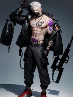 hezi, Cyberpunk, Sotai, 1boy, weapon, mask, male focus, abs, tattoo, gun, solo, jacket, pants, shoes, gloves, mouth mask, pectorals, belt, white background, open clothes, muscular, muscular male, bare pectorals, open jacket, simple background, white hair, piercing, navel, looking at viewer, black pants, rifle, black gloves, black jacket, collar, short hair, chain, stomach tattoo, ear piercing, blue eyes, jewelry, standing, full body, bara, arm tattoo, black belt, sneakers, black mask, large pectorals, necklace, grey eyes, nipples, earrings, assault rifle, covered mouth, underwear, holding, chest tattoo, dog tags, no shirt, shield, neck tattoo, buckle, scar, holding weapon, bangs, chain necklace, male underwear, choker, spiked hair, black collar, collarbone, grey hair, watch, thong, stomach, hand in pocket, nipple piercing<lora:索泰:0.7>