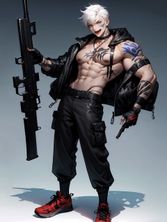 hezi, Cyberpunk, Sotai, tattoo, 1boy, muscular, solo, abs, male focus, muscular male, weapon, arm tattoo, pectorals, bara, pants, nipples, gun, jacket, large pectorals, navel, jewelry, belt, shoes, gloves, open clothes, white background, bare pectorals, looking at viewer, earrings, collar, white hair, open mouth, tongue, smile, holding, open jacket, teeth, short hair, holding weapon, simple background, black gloves, bandages, socks, black belt, chain, chest tattoo, blue eyes, bandaged arm, holding gun, piercing, biceps, black pants, choker, black jacket, tongue out, navel hair, stomach tattoo, thick arms, sharp teeth, buckle, fingerless gloves, fang, obliques, necklace, fangs, rifle, ear piercing, sleeveless, grey hair, full body, no shirt, mature male, sneakers, black socks, torn clothes, artist name, hood, vest, belt collar, black choker, stomach, standing, belt buckle<lora:索泰:0.7>