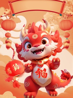 The character is holding a string of red firecrackers,a vibrant and animated character that appears to be a fusion of a dragon and a lion. The character is predominantly red with white accents, and it has a cheerful expression with wide eyes and a broad smile. It holds a golden bell in one hand and a golden rattle in the other. The character is adorned with a golden necklace that has a pendant with Chinese characters. The background is a warm orange hue, with floating lanterns and a silhouette of a mountain rangee<lora:LONG IP:1>