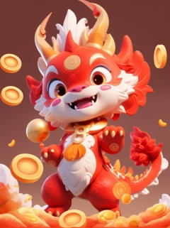 a vibrant and animated character that appears to be a fusion of a dragon and a lion. The creature has a bright red body with white and orange accents, large expressive eyes, and a playful expression. It has a pair of golden horns on its head and a golden collar around its neck. The character is surrounded by golden coins, which are floating in the air around it. The background is a gradient of warm colors, transitioning from a deep orange at the top to a lighter hue at the bottom<lora:LONG IP:1>