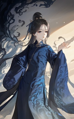 (abstract art:1.4), masterpiece, best quality, ultra high res, beautiful, visually stunning, (1girl:1.3), (dark blue theme:1.2), deep blue, cowboy shot,girl,wuxia,Chinese style,(Small chest:0.75),niji, sunlight, monkren