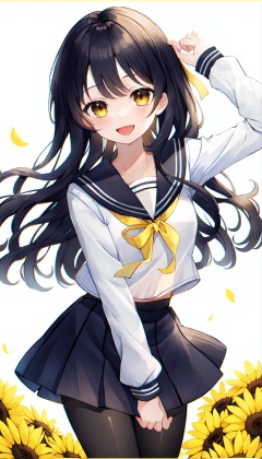 1girl, solo, sailor collar, black hair, long hair, flower, ribbon, looking at viewer, neck ribbon, smile, bangs, school uniform, shirt, open mouth, white shirt, black sailor collar, serafuku, :d, pantyhose, yellow ribbon