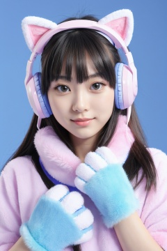 1girl,20 years old,asians,Wearing blue electronic sports headphones and furry paws gloves,Big Eyes,(neko:1.1),( pastel :1.2),( Kawai mood :0.9),ultra realistic,high-definition,hd,8k,