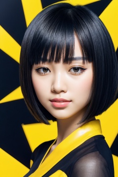 abstract portrait of an asian girl,bob_cut,fault art style,yellow and black color,passion,and freedom,blurred boundaries,high resolution,aesthetic,