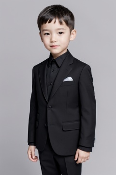 1boy,5 years old,asians,solo,child,crew cut,black suit,white background,medium shot,85 mm Lens,masterpiece,(extremely delicate),(best quality),ultra high res,