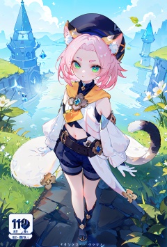 simple_green_background, golden and white theme, Sense of coordination, sense of order, mathematics beauty, (((cover design))), (((((cover art))))), ((trim)), album_art, official art, (Master's work), full body, ( closeup, 1girl,solo:1.2),<lora:diona-v100-000027:0.8:lbw=OUTALL>,diona, sidelocks, diona (genshin impact), cat ears, 1girl, puffy detached sleeves, animal ears, detached sleeves, bangs pinned back, belt,cat girl, pink hair, forehead, short hair, navel, hat, black shorts, white gloves, thick eyebrows, green eyes, cat tail, animal ear fluff,sunshine, sky, leaf, animal patterns, white geometry, colorful geometry, reflection, crystal_art, pattern_design, creative, Mystery pattern, colorful crystal decorate, blue crystal, (architectural art), ((geometric art)), pattern design, creative, shine, dream,walk in forest, enjoy the nature, freedom, cute girl,<lora:nai3lora:0.6>,nai3,------,Low saturation, grand masterpiece, Perfect composition, film light, light art,