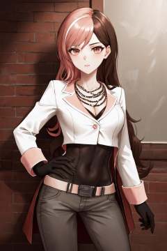 masterpiece, (detailed, highres, best quality), 1girl,  <lora:sprwbyNeopolitan-27:1> neopolitandef, necklace, white jacket, leotard, black gloves, black pants, belt
