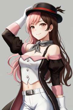 masterpiece, (detailed, highres, best quality), 1girl, <lora:sprwbyNeopolitan-27:1> neopolitanatlas, bowler hat, grey scarf, white gloves, white shirt, off-shoulder shirt, black sleeves, midriff, white belt, white pants, blurry, depth of field, simple background, white background, Profile View, closed mouth, finger to mouth, head tilt, light smile, looking at viewer, raised eyebrows, solo