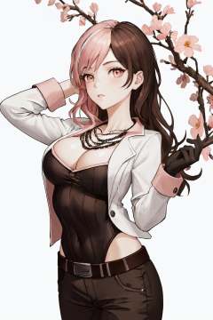 masterpiece, (detailed, highres, best quality), 1girl,  <lora:sprwbyNeopolitan-27:1> neopolitandef, necklace, cleavage, white jacket, leotard, black gloves, black pants, belt, flower, from above, pink flower, portrait, simple background, white background, Long shot, hands up, looking at viewer, sideways glance, solo