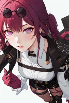 masterpiece, (detailed, highres, best quality), 1girl, face focus, close-up, <lora:sphsrKafker-09:1> kafkerdef, earrings, eyewear on head, sunglasses, white shirt, black jacket, long sleeves, purple gloves, shorts, pantyhose, thigh strap, black footwear