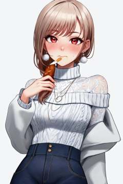 masterpiece, (detailed, highres, best quality), 1girl, <lora:spfureneLustario:1> lustario3st, earrings, necklace, turtleneck sweater, ribbed sweater, high-waist pants, grey background, simple background, upper body, white background, :t, blush, closed mouth, eating, food on face, looking at viewer, solo