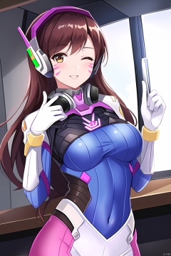 1girl, solo, long hair, breasts, looking at viewer, smile, bangs, brown hair, gloves, brown eyes, medium breasts, upper body, parted lips, one eye closed, indoors, white gloves, window, bodysuit, covered navel, headphones, facial mark, skin tight, index finger raised, pilot suit, whisker markings, shoulder pads, blue bodysuit, ribbed bodysuit, d.va \(overwatch\), masterpiece