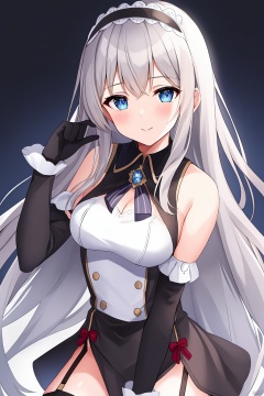 1girl, solo, long hair, breasts, looking at viewer, blush, smile, bangs, blue eyes, simple background, thighhighs, gloves, white background, dress, bare shoulders, medium breasts, very long hair, closed mouth, standing, grey hair, detached sleeves, black gloves, black thighhighs, white dress, headgear, garter straps, own hands together, mecha musume