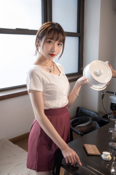 1girl, solo, cup, brown hair, realistic, skirt, looking at viewer, indoors, brown eyes, short hair, teacup, jewelry, table, instrument, holding, smile, necklace, holding cup, teapot, red lips, short sleeves, lips, standing, makeup, lipstick, bangs, drum ,