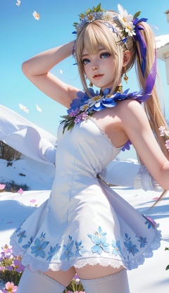 masterpiece,highres,1girl,solo,sfw,<lora:add_detail:0.3>,thighhighs,((beautiful Dress+stocking):1.25),((flower headdress:1.45)),((white theme:1.5)),snow,outdoors,snowflakes,sleeveless,3D graphics,looking_at_viewer,front view,dynamic pose,marie rose,twintails,<lora:marierose-000005:0.7>,blue eyes,