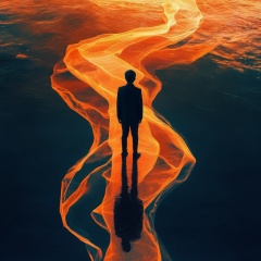 zailus,solo,short hair,1boy,standing,male focus,from behind,glowing,fish,size difference,silhouette,facing away,giant,surreal,orange theme,<lora:lora-000008:1>,