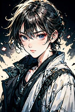 1boy,solo, looking at viewer, simple background, 1boy, hair between eyes, closed mouth, jacket, upper body, male focus, white jacket, black background, portrait, science fiction,