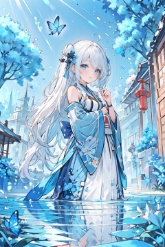blue ru_qun,best_quality,head,original_outfit,hanfu,clear details,masterpiece, best_quality, clear details,1girl,garden background,, butterfly on finger,blue eyes,white hair,long hair,big eyes ,yuzu,liquid clothes,girl,Anime,azur lane, Chinese style, best quality, Apricot eye, Fangren