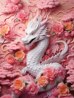 a white dragon with pink flowers on a pink background with pink flowers and pink clouds, Mini, HFJL