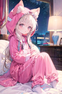 Loli, solo focus, full body, sitting, dynamic angle, white hair, flat chest, frilled, 3yo, brown hair, long hair, night, starry sky, dark, sleepy, want to sleep, animal ears hood, A young girl in pajamas holding a large stuffed animal, with a shy expression on her face, in a bedroom setting, The composition should exude a blend of sensuality and innocence, The background should be visually captivating,