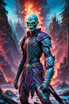 winter landscape, with a (((emaciated:1.5))) (((desiccated:1.5))) male warlock with pallid white skin, dressed in furs and (((leather armour:1.4))) once attractive, he is a (((necromancer:1.2))), a undying, reborn, he is (((skinny:1.7))) and (((slim:1.6))) dressed in a robes and a cloak, his face has an unearthly beauty, his clothes are torn and tattered, flapping in the wind, (((musclular:1.5))), (((undead:1.6))), striding through fire