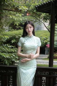 1girl,outdoor,looking_at_viewer,side_blunt_bangs,china_dress,chinese_style,big breasts,pose,solo,1girl,black hair,black eyes, , qipao
