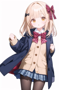 OMIC,1girl,loli,bag,bangs,fishnet_legwear,pantyhose,plaid,plaid_skirt,pleated_skirt,skirt,solo,unmoving_pattern,long_hair,looking_at_viewer,shirt,hair_ornament,long_sleeves,bow,standing,jacket,hair_bow,parted_lips,open_clothes,blunt_bangs,medium_hair,:o,coat,sleeves_past_wrists,open_coat,simple_background,beige_background,