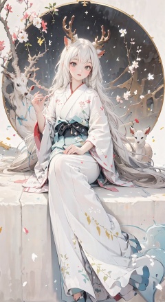 The image features a white deer with long, flowing antlers and a blooming cherry blossom tree growing out of its back. The deer is lying down in a field of gold, with a half-opened eye that appears to be looking at the viewer. The background is a mix of gold, white, and black, with a wave pattern in the bottom right corner. The overall style is reminiscent of traditional Japanese art, with delicate lines and muted colors. The quality of the image is high, with no visible noise or grain. The person in the lower right corner is wearing a black coat and hat, with a handbag in their other hand. They appear to be in a state of contemplation, their gaze directed towards the deer. The deer itself appears serene, with a slight smile on its face. The contrast between the gold field and the white deer creates a sense of depth and dimension in the image.