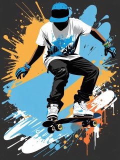 AiArtV,t-shirt design, shirt,gloves,1boy,hat,full body,short sleeves,male focus,shoes,pants,bracelet,shadow,black pants,white footwear,baseball cap,blue headwear,silhouette,paint splatter,skates,skateboard