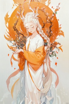 The image is an anime style representation of a beautiful girl in a flowing white and orange dress, surrounded by a vibrant red and orange floral arrangement. The lighting is soft and warm, casting a golden glow on the girl and her surroundings. The colors are vibrant and rich, with the red and orange hues of the flowers and her outfit creating a striking contrast against the white background. The girl appears to be in a state of deep thought, her lips slightly parted as if in mid-conversation. The image is well-composed, with the girl standing in the center of the frame, surrounded by the vibrant red and orange hues of the flowers and her outfit. The background is simple yet effective, with a white wall providing a clean and uncluttered backdrop. The girl's outfit is intricately designed, with flowing sleeves and a delicate floral pattern on her skirt. Her hair is finely detailed, with intricate braids and curls. The flowers around her are similarly detailed, with delicate petals and intricate branching patterns. The image is a beautiful and well-crafted representation of the anime genre, with its vibrant colors, intricate details, and flowing lines creating a sense of movement and energy. The girl's deep thoughtfulness and striking appearance make her a captivating subject, and the soft lighting and close-up composition add a sense of intimacy and connection to the viewer.