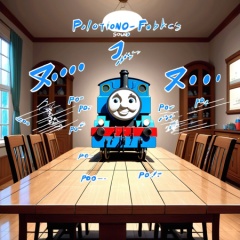 Thomas the **** engine,  on table, dining room, text, ("PO":1.3), (motion lines, sound effects:1.9), no humans, masterpiece, best quality