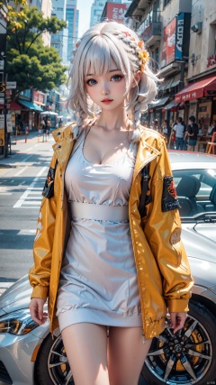 1girl, solo, long hair, looking at viewer, blush, bangs, blue eyes, long sleeves, dress, standing, collarbone, jacket, braid, white hair, multicolored hair, cowboy shot, outdoors, parted lips, open clothes, white dress, twin braids, lips, streaked hair, coat, makeup, ground vehicle, motor vehicle, zipper, red lips, car, yellow jacket, xihua, chang