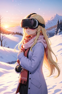 anime, pastel colors, girl, wearing (vr goggle:1.5), HTC Vive, blonde hair, long hair, winter clothes, scarf, sunset, scenery, bokeh, depth of field